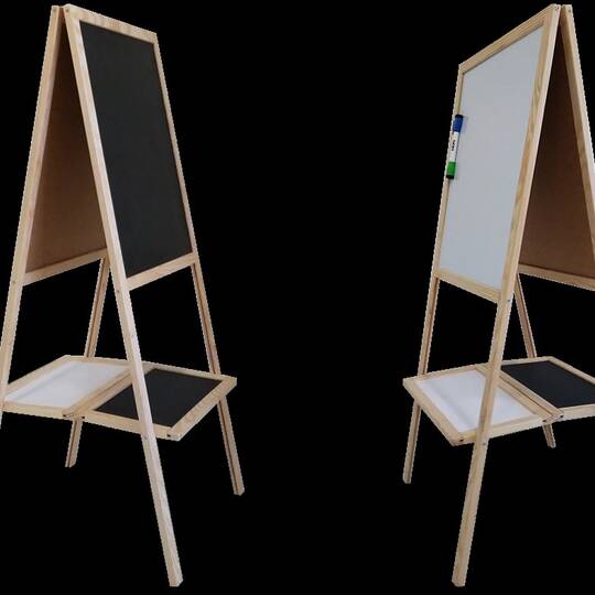 It has a large double-sided shelf for storing pencils, chalk and erasers.